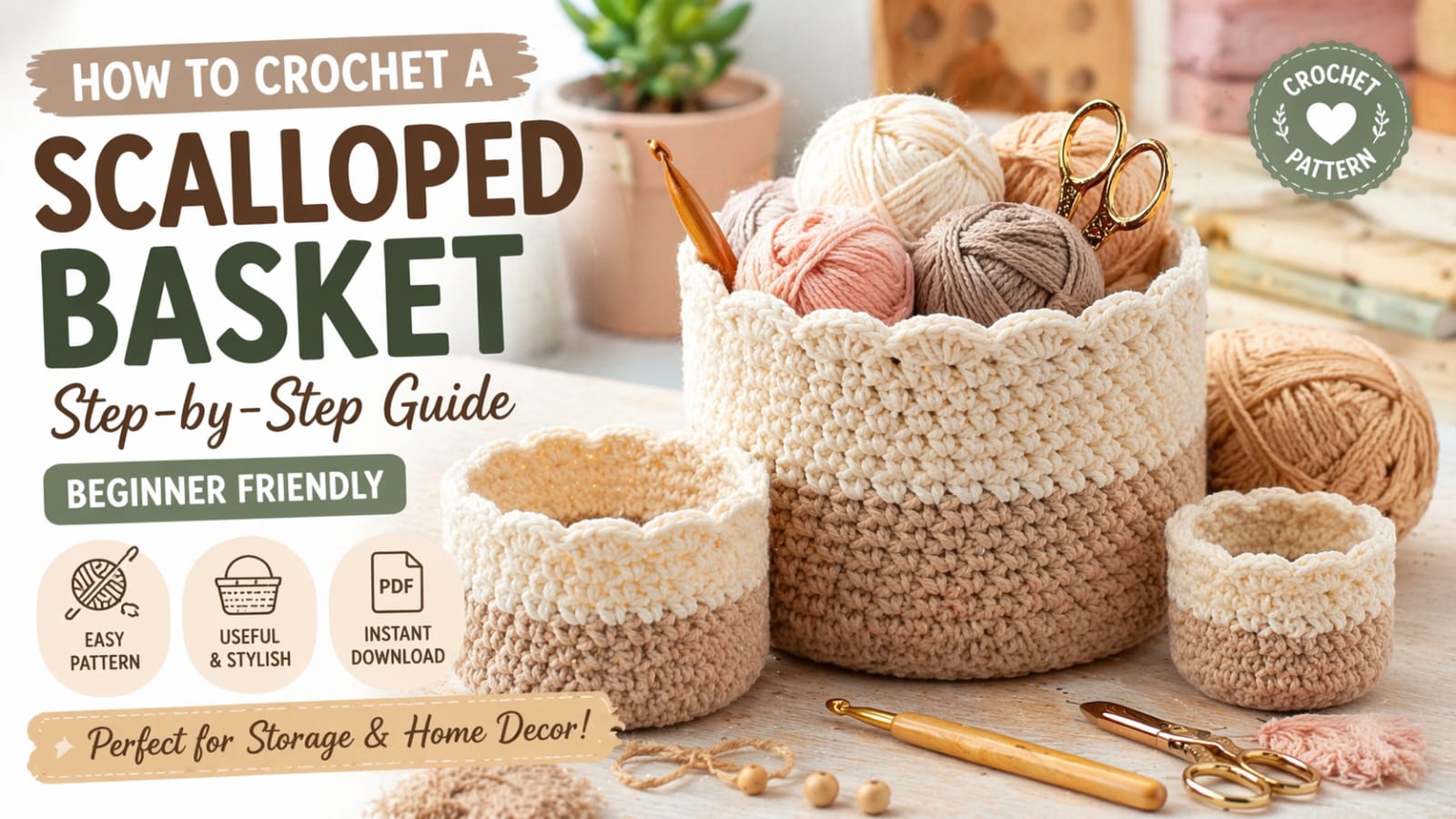 This crochet scalloped basket pattern is perfect for beginners who want to create a beautiful handmade crochet storage basket for home organization and decoration.