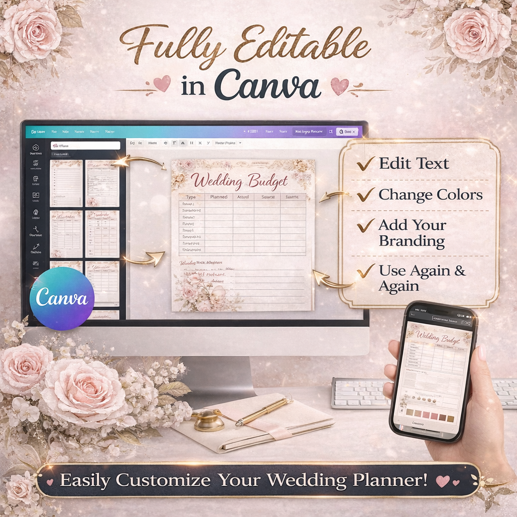 Plan your dream wedding with this elegant 2026 Wedding Planner Printable. This beautifully designed planner includes 70 organized pages to help brides manage every detail of their big day — from budgeting and guest lists to venue planning and schedules. The planner comes with a printable PDF file and an editable Canva template, making it easy to customize and reuse.