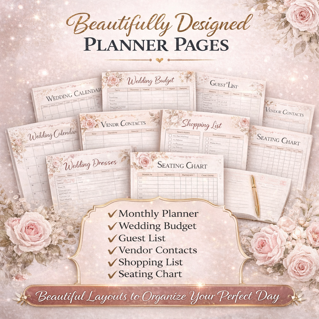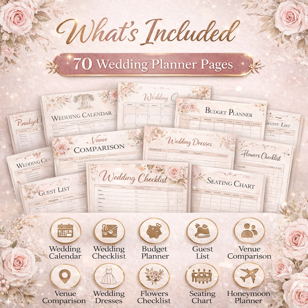 This beautifully designed planner includes 70 carefully organized pages that cover every important aspect of wedding planning. From budgeting and guest lists to vendor management and seating charts, everything you need is included in one easy-to-use planner.