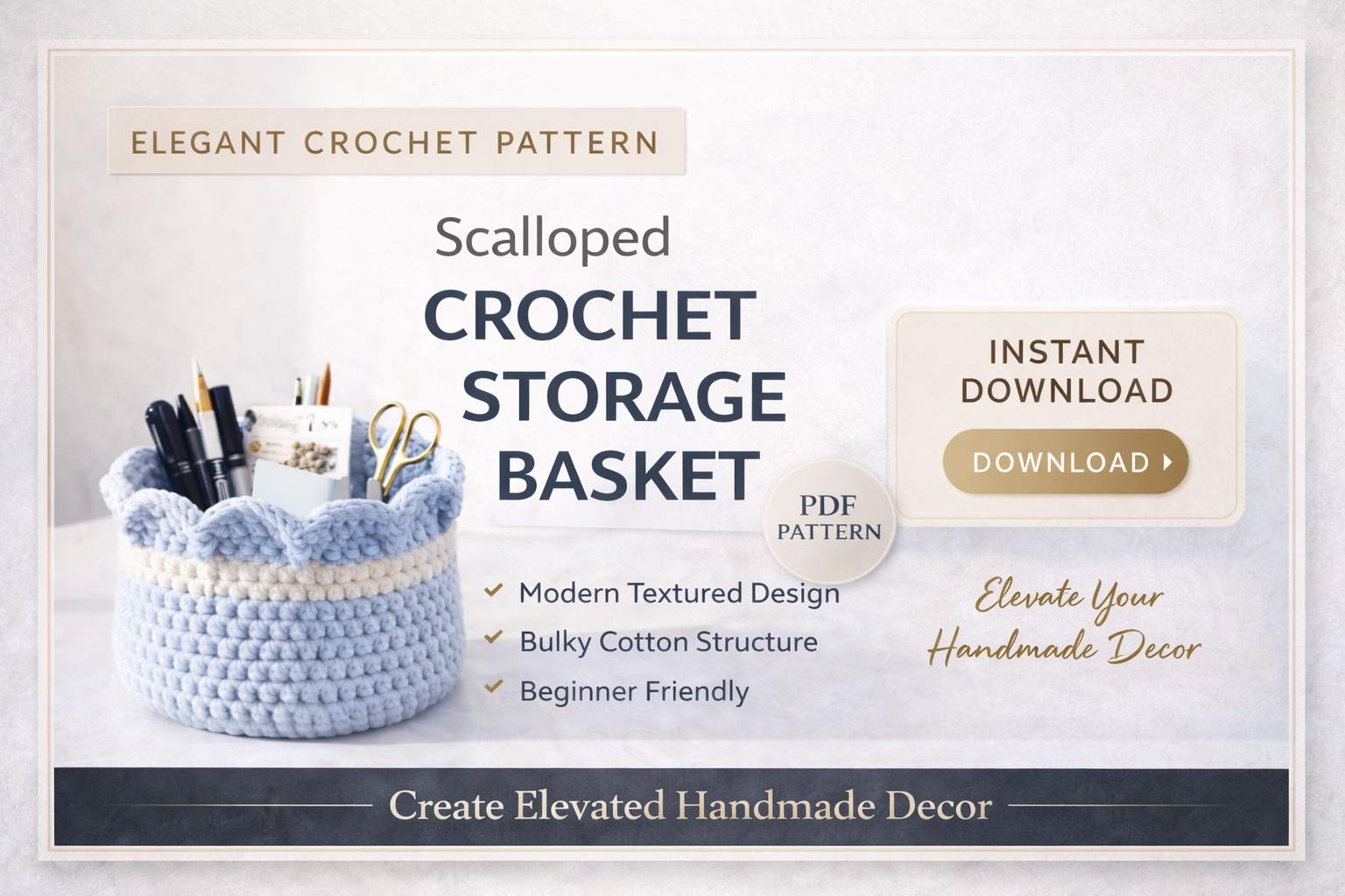 Add a refined handmade touch to your home with this scalloped crochet basket pattern. This professionally designed PDF pattern guides you step-by-step to create a sturdy, textured storage basket finished with a soft decorative scalloped edge.