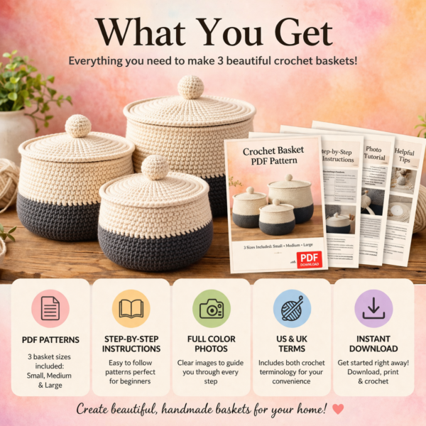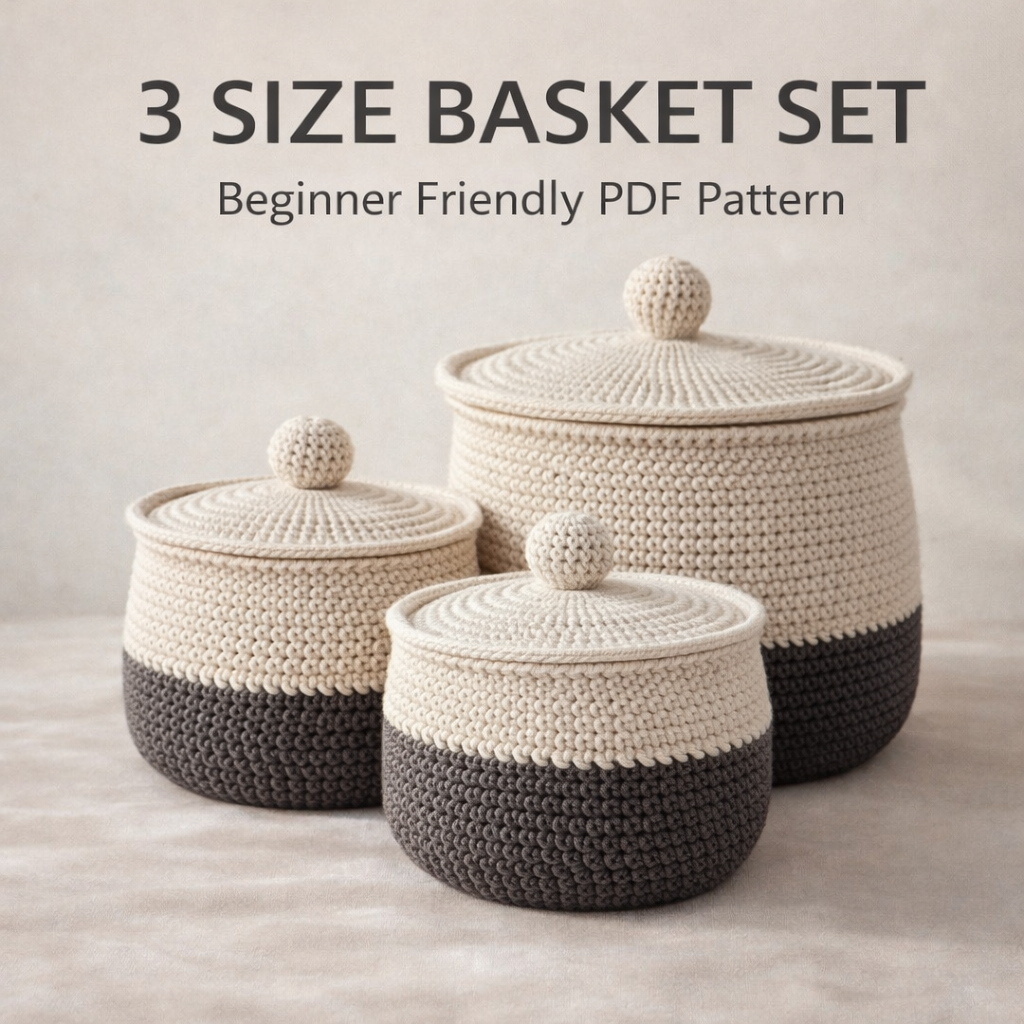 Create a beautiful and practical set of crochet storage baskets with this Crochet Basket Set Pattern PDF. This beginner-friendly tutorial shows you how to make three modern nesting baskets that are perfect for home organization, nursery storage, bathroom decor, or handmade gifts.