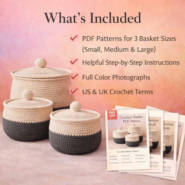 Create a stylish and functional storage solution for your home with this Crochet Basket Set Pattern PDF. This beginner-friendly crochet pattern teaches you step-by-step how to create a beautiful set of three nesting crochet baskets in different sizes.