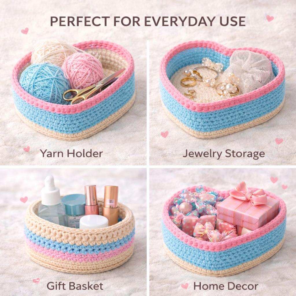 One of the best features of this crochet heart basket is its versatility. The basket can be used in many different ways around the home. It works beautifully as a gift basket, making it a great option for holidays, birthdays, or Valentine’s Day gifts. It can also be used as a jewelry holder to organize rings, bracelets, or small accessories. Many crocheters also enjoy using it as a yarn holder or craft organizer for small crochet supplies.