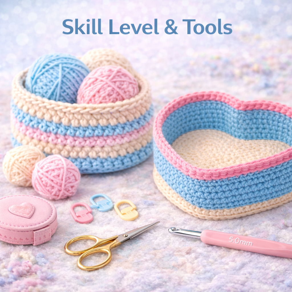 This crochet basket pattern is written in clear US crochet terms and is designed to be easy to follow. Even beginners who know the basic crochet stitches can successfully complete this project. The instructions are written in a simple and structured way so that crocheters can move through each round confidently while creating a neat and attractive heart shaped basket.