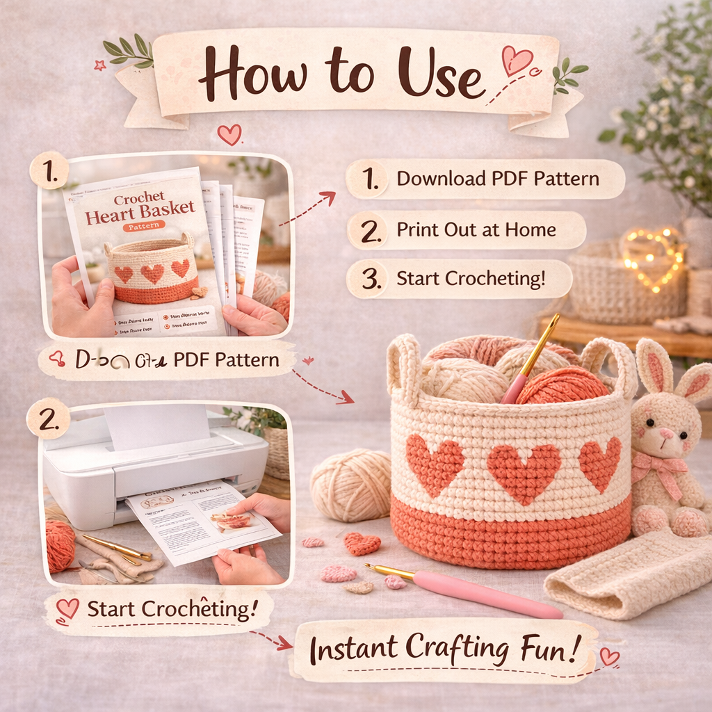 This Crochet Heart Basket Pattern PDF is designed to help beginners and experienced crocheters create a beautiful handmade storage basket. The pattern includes clear step-by-step instructions and helpful tips so you can easily follow along and complete your project.