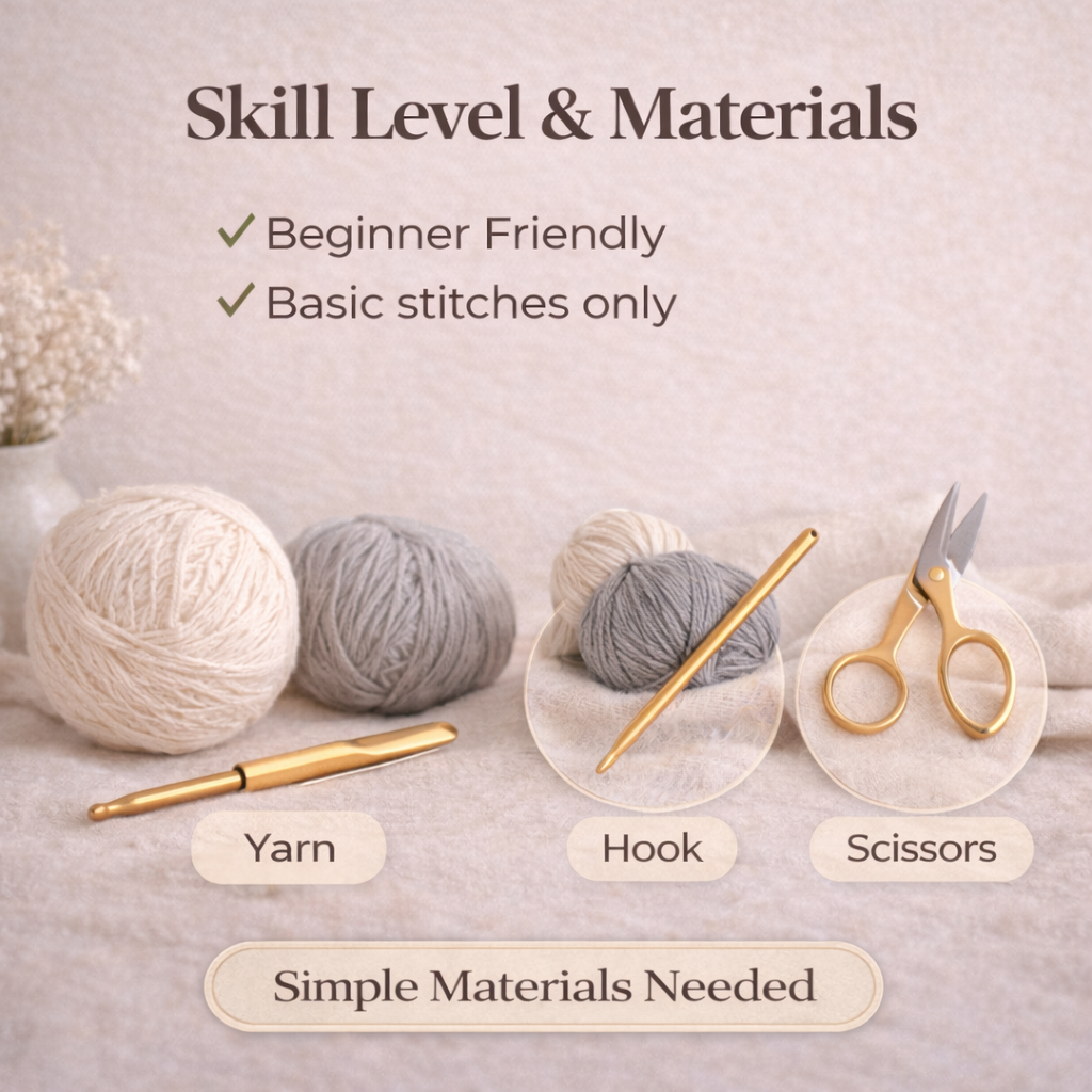 - Crochet hook (4mm – 5mm depending on yarn)