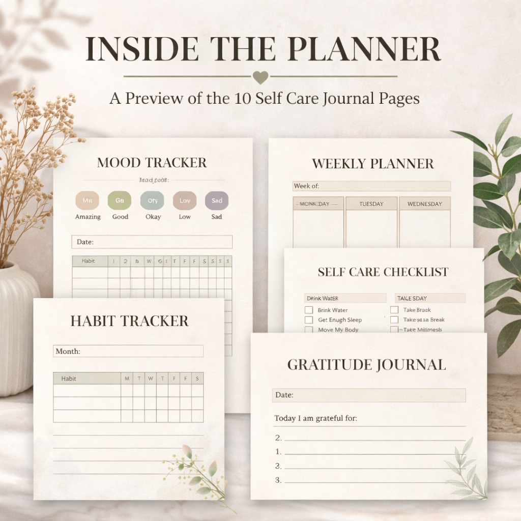 This Self Care Journal contains 10 useful planner pages designed to support mindfulness and daily reflection.
